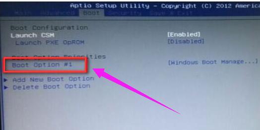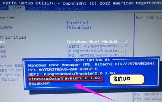 在“boot”中找到“boot option #1“按回车键,找到u盘。