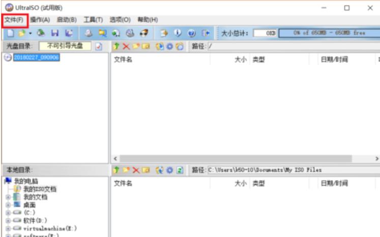 2,开UltraISO后,它的操作界面如下图所示,点击左上角的文件,然后再点打开。选择我们刚才展示的CentOS 7.4 安装镜像。然后点击打开。