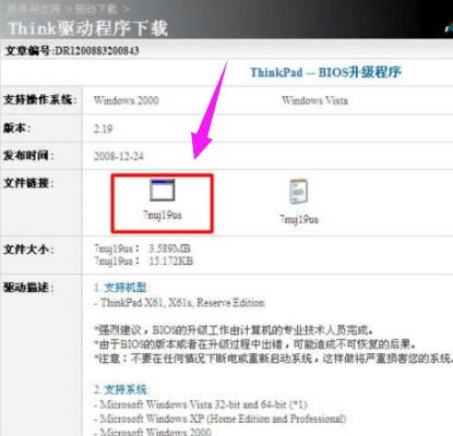 以ThinkPad X61为例,登陆http://think.lenovo.com.cn 在左侧输入主机7位型号,然后就打开了如下图的下载页。要进行光盘升级,则点击BIOS中的第一个:BIOS升级程序。