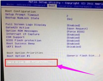然后按上下方向键将光标移动到“Hard Drive BBS Priorities”选项,