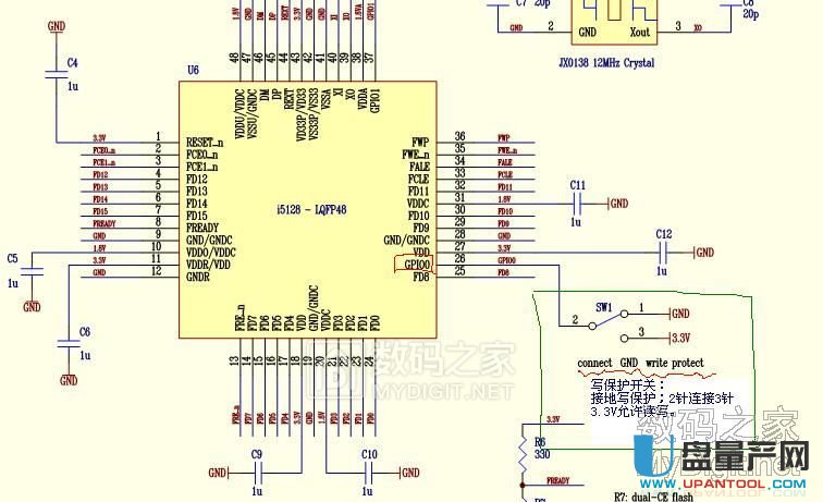 首选是最关键的写保护开关跟主控的接线图。上图可以看到开关需要飞线到GPI00端也就是pin26,开关另一端接地。