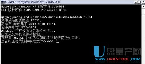 在提示是否将丢失的链接转换成文件的话,可以直接输入y,然后按回车,即可对优盘的存储进行重新修复: