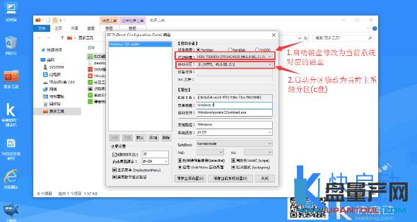 8、点击“添加”后,会出现默认的初始BCD内容,在此基础上,我们进行win7+win10 BCD的修改,主要将“启动磁盘”修改为“当前系统对应的磁盘”;“启动分区”修改为“当前主系统分区(C盘)”。