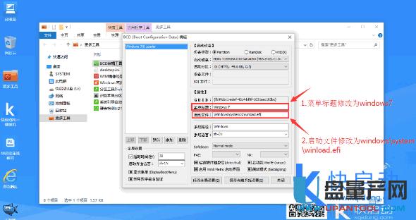 9、接着将“菜单标题”改为“windows7”,将“启动文件”修改为"windows\system\winload.efi",在此需注意的是启动文件winload.efi 为UEFI+GPT启动文件,如果是修复Legacy+MBR启动文件,此处应为winload.exe。 修改后,点击“保存到当前系统设置”。