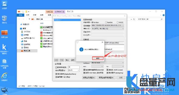13、弹出“BCD数据修改成功”提示框,点击确定,这样win7和win10的引导信息就会保存到我们创建的这个BCD文件中了,重启电脑就可以显示win7win10启动项了。