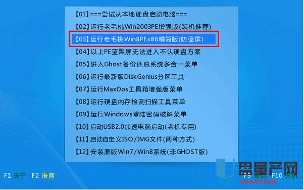选择u盘启动并按下回车键确认就可以进入老毛桃的主菜单界面,然后将光标移至“【03】运行老毛桃 Win8PEx86精简版 (防蓝屏)”后按回车键确认;
