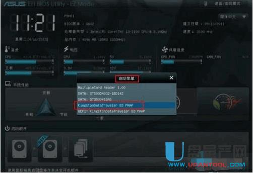 然后选中“U盘”作为优先启动项,按“回车”键确认,如这里选的是“Kingston”,即金士顿的U盘。