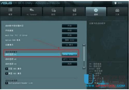 3.用键盘“上下方向键”切换到“启动选项#1”,按“回车”确认