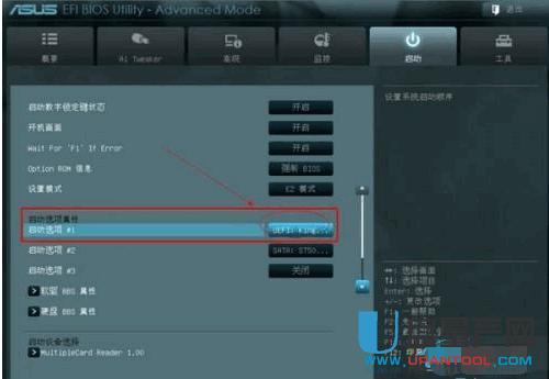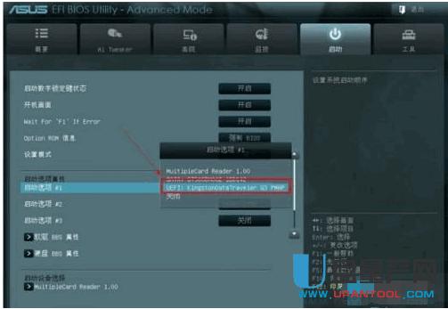 4.回车确认后弹出如下图“启动选项#1”选择菜单,按键盘“上下方向键”切换到“U盘”即可,和方法一一样