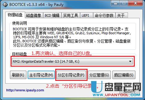 1、同样确定目标磁盘是否是你的U盘分区,然后点击分区引导记录按钮。