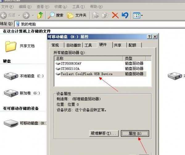 第三步,选择“硬件”选项页,在“名称”中选择你的U盘,单击属性。