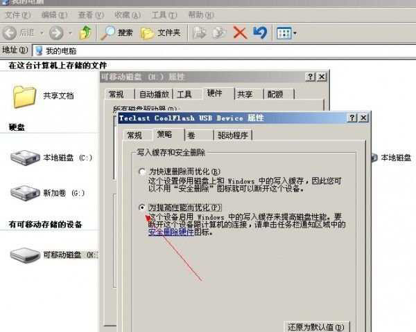 第四步,在打开的“属性”对话框中,选择“策略”,再选择“为提高性能而优化”。