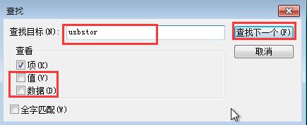 3、弹出查找窗口,在查找目标中输入usbstor,然后去掉值和数据选项的勾选,点击查找下一个按钮,如图: