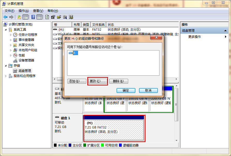 3、接着我们找到u盘盘符,然后右击该磁盘选择“更改驱动器名和路径”在弹出的窗口中点击“更改”按钮;如下图所示: