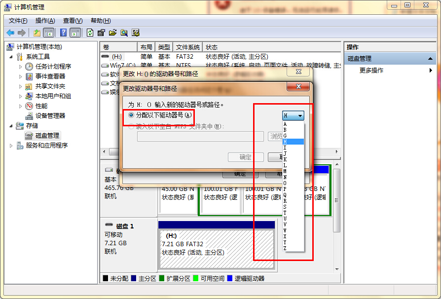4、接下来我们选择“分配以下驱动器号(A)”,然后通过右边的“下拉菜单”将其重新分配一个磁盘盘符,最后点击“确定”按钮即可;如下图所示: