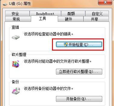 2、依次打开“计算机” — 右键U盘选择“属性”—“工具”(选项卡),如下图所示: