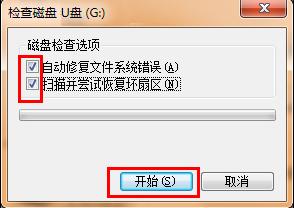 3、接着点击“开始检查”— 勾选“自动修复文件系统错误(A)”、“扫描并尝试恢复坏扇区(N)”——然后点“开始(S)”就可以了。如下面图示: