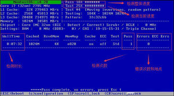 Pass:进行内存检测的次数,经过这一次检测后,下次检测时这里的数值将会是“1”,并且每一次的检测都会累计上去。