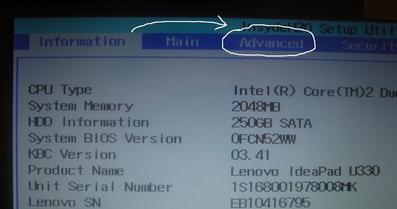 电脑开机,当屏幕出现大大的LENOVO那个画面时,按F2进入BIOS,进入BIOS后,利用键盘上下左右键调整选项,然后选中Advanced。
