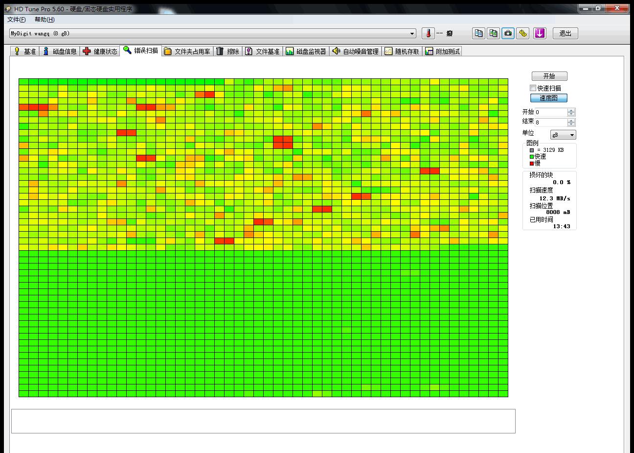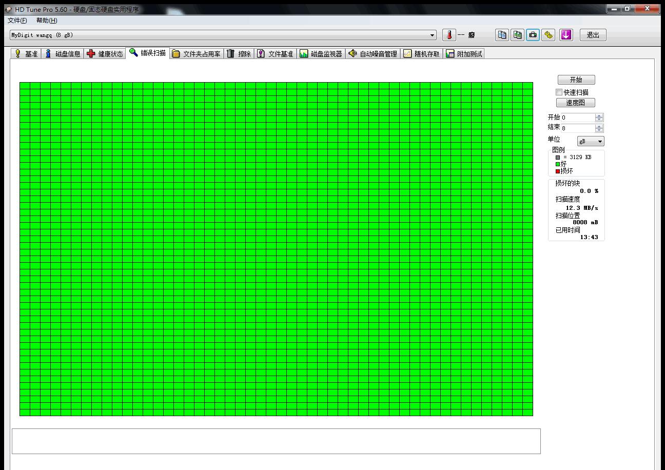 2. 在测试结束后,使用HD Tune扫描U盘坏块: