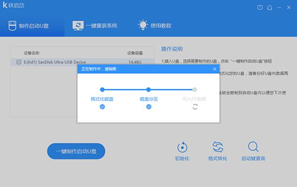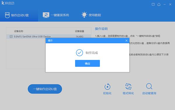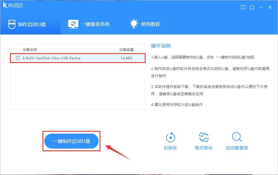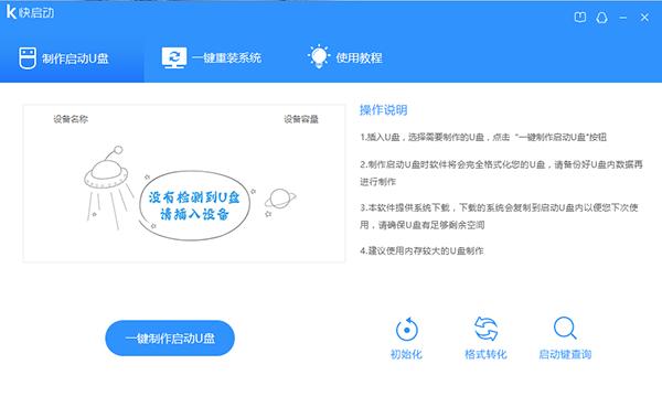 第一步:双击下载在桌面上的快启动图标,进入快启动U盘启动盘制作工具窗口,插入U盘,备份U盘个人重要文件,因为制作工具中会删除U盘上的所有数据,如图所示: