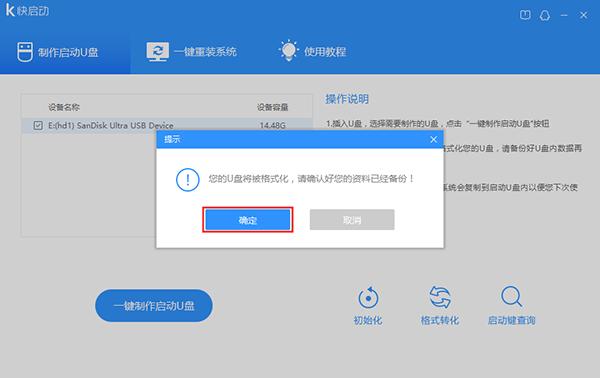 第三步:随即弹出执行您的u盘将被格式化,请确认好你的资料已经备份,点击“确定”按钮,继续操作,如图所示: