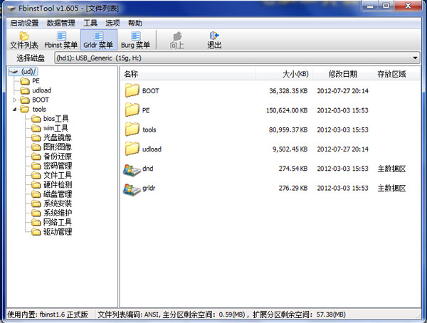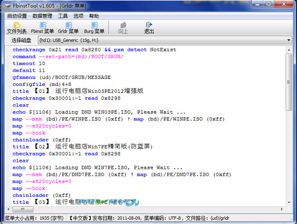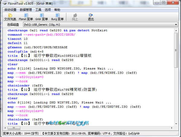 2、打开“FbinstTool”(此时U盘要插在电脑上哦)软件会自动加载U盘的隐藏文件,点“Grldr菜单”,然后我们就可以对PE启动菜单进行个性化修改了。