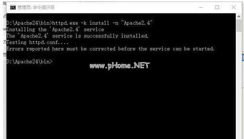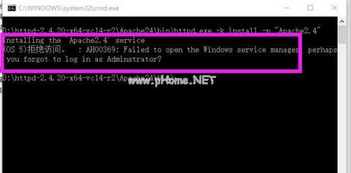 2、然后在执行上面第三步,定位到path:/bin,运行httpd.exe -k install -n “Apache2.4”即可。