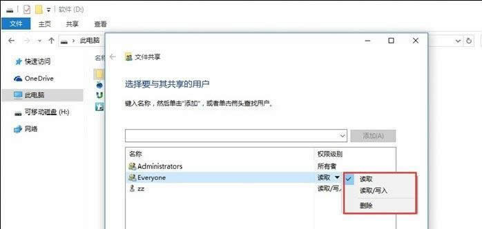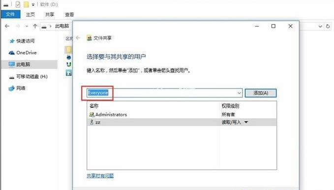 2.在弹出的文件共享界面中添加用户,如果是对对局域网内的所有用户开放,就选择everyone账户。
