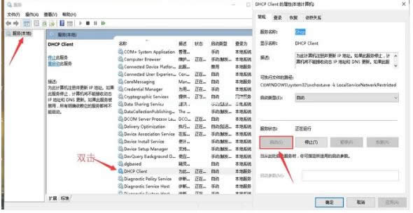 打开服务,选择DHCP Clent并点击,出现右侧界面时选择启动并点击确定。