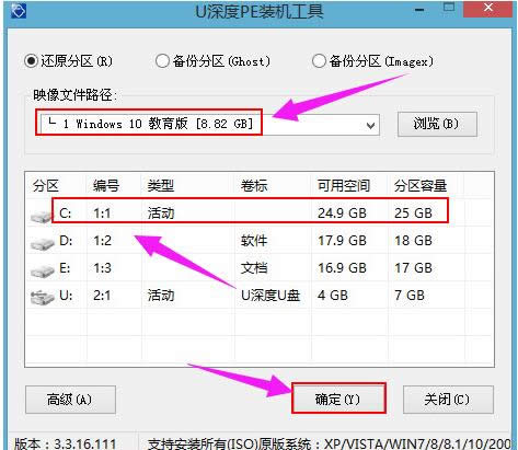在u深度pe一键装机工具窗口中,点击“浏览”将原版系统安装包添加进来,在磁盘列表中选择c盘作为系统盘,点击确定