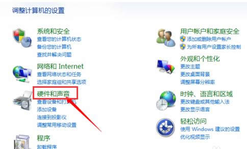 在控制面板中点击硬件和声音选项。