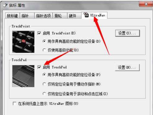 打开鼠标属性窗口后,选择UltraNav选项卡,找到TouchPad,并取消勾选启用TouchPad选项就可以关闭触摸板了,反之要启用TouchPad就将其勾选。
