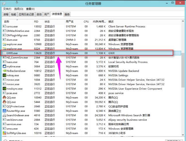 打开任务管理器,仔细查看并找到GWX.exe进程。
