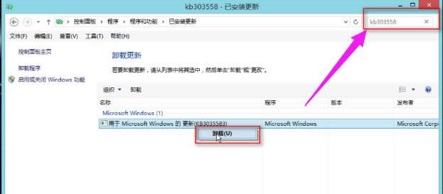 通过右上角的搜索功能所搜,输入KB303558,我们在这个补丁上面右键选择【卸载】