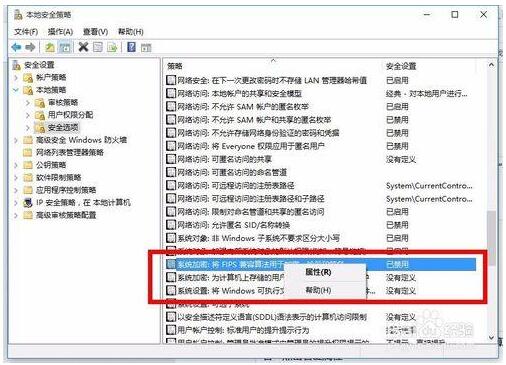 第五部:在右边的策略中,找到“系统加密:将FIPS算法用于加密 、哈希和签名”点击右键属性