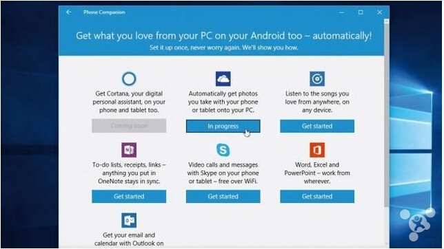 iPhone 或者 Android 手机用户可以点击手机助手界面中的相应按钮,通过弹出的选项列表来查看可以执行的操作。登陆微软账户就可以访问账户设置和存储在 OneDrive 里的文件。每一个按钮都会通过一步一步的向导告诉你需要做什么。