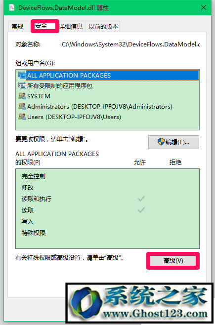 在打开的DeviceFlows.DataModel.dll 属性窗口中,点击【安全】-【高级】;