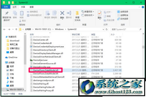 第二步:把新版win10系统-15025版中的DeviceFlows.DataModel.dll文件复制到新版win10系统-15031版的system32文件夹中。