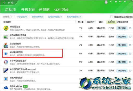 3、接下来在启动项列表中找到“SQL服务管理器”并选择“禁用”,同样在应用软件服务列表中重复以上操作,找到并禁止“SQL服务管理器”。