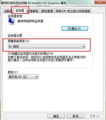 3.在新出现的界面中切换到监视器选项,在屏幕刷新频率选项中选择合适的分辨率,点击确定即可。