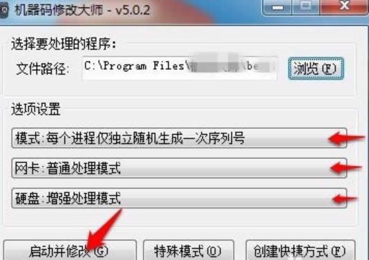 4,打开软件后点击左上角的浏览-选择需要改机器码的软件-选项设置默认(也可以按自己的需求选择)-启用并修改