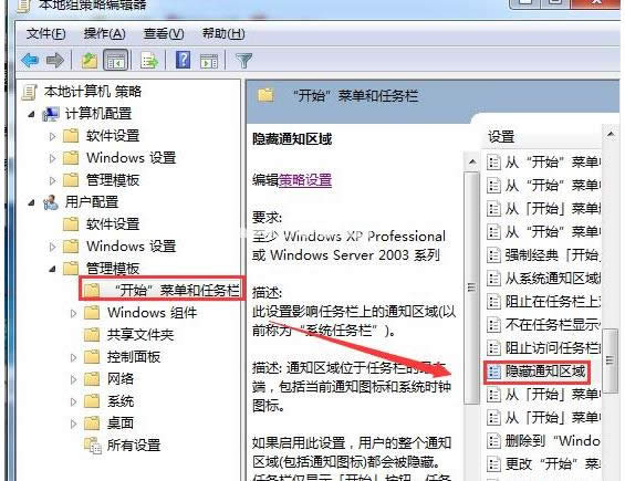 2.在本地组策略编辑器窗口中依次打开“用户配置-开始菜单和任务栏”,然后再右侧列表中找到“隐藏通知区域”打开。