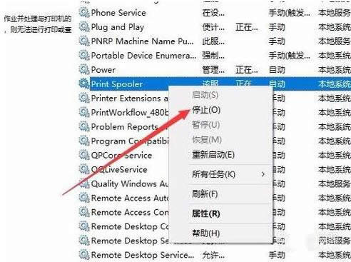 1、在打开的服务窗口中找到Print Spool服务项,右键点击该项,然后在弹出菜单中选择“停止”菜单项,先停止该服务。
