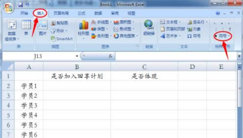1.首先打开一个excel表格,在主界面中点击“插入”,然后在右侧找到“符号”选项打开。