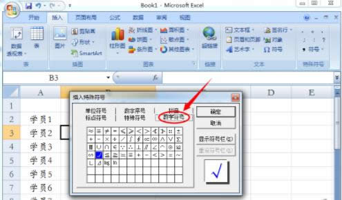 2.接着会弹出一个特殊符号的对话框,在这里有很多特殊符号,在“数字符号”中找到对号,点击即可输入。