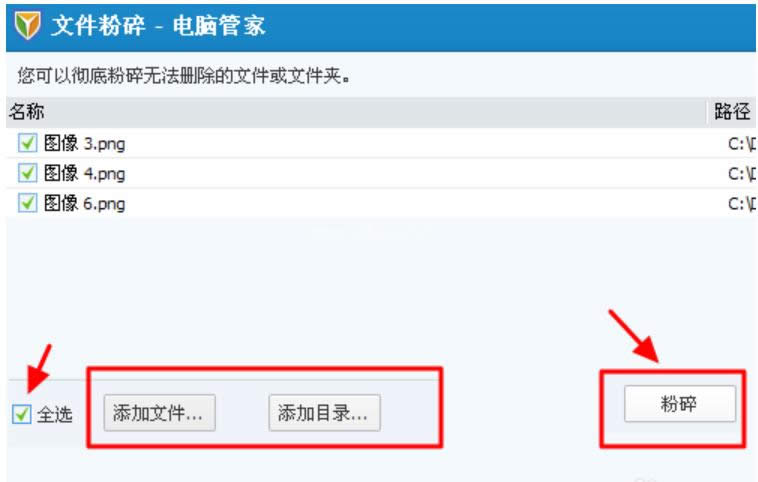 5,这里可以将文件拖进粉碎框中,也可以选择“添加文件”或者“添加目录”,添加好之后,点击“粉碎”,这样就将顽固文件粉碎了。