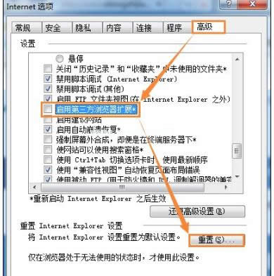 打开【Internet 选项】中的【高级】页面,在【设置】里面,找到【启用第三方浏览器扩展】,把“√”去掉,