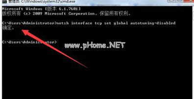 在命令行输入【netshinterfacetcpsetglobalautotuning=disabled】命令,点击回车键,等待出现确定。表示成功