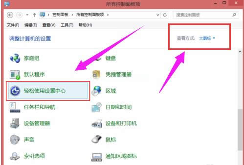 在查看方式中选择“大图标”,选择“轻松使用设置中心”